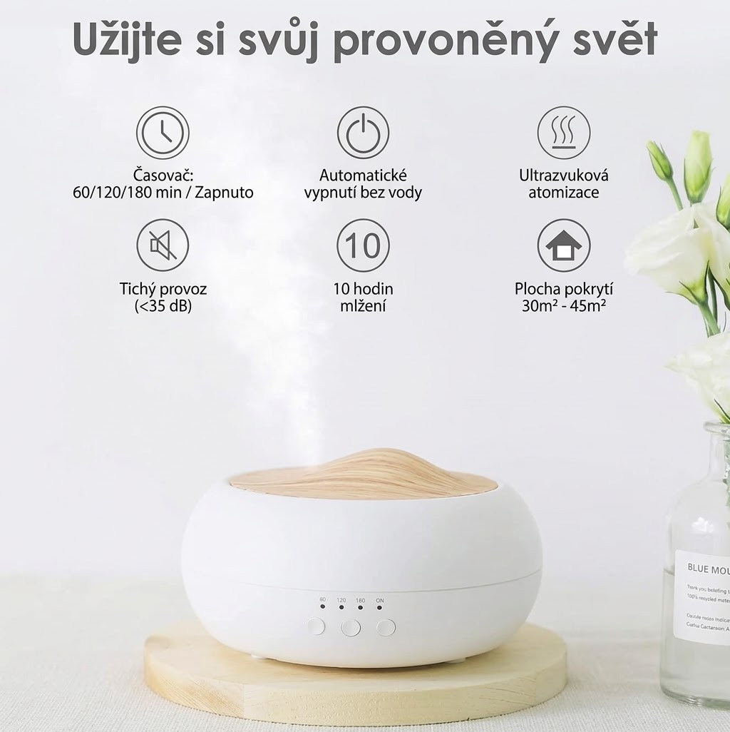 Difuzér zároven funguje jako zvlhcovac vzduchu. V zimních mesících, kdy vytápení vysušuje vzduch v interiérech, pomáhá udržet príjemnou vlhkost. To prispívá ke zdraví dýchacích cest, pokožky i sliznic.